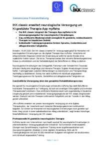 Dresden, 16. April 2026 - Die IKK classic erweitert ihr Versorgungsangebot für Menschen mit neurologischen Erkrankungen um die digitale Therapie-App myReha. Versicherte mit entsprechender Diagnose können die Anwendung ab sofort für sechs Monate ohne zusätzliche Kosten nutzen. Ziel ist es, Therapieprozesse über einzelne Behandlungstermine hinaus zu unterstützen und die Selbstständigkeit der Betroffenen im Alltag zu stärken.