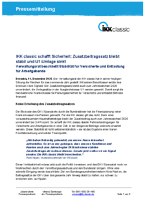 Dresden, 11. Dezember 2025 - Der Verwaltungsrat der IKK classic hat in seiner heutigen Sitzung die Weichen für das kommende Jahr gestellt. Mit seinen Beschlüssen setzte das Gremium klare Signale: Der Zusatzbeitragssatz bleibt auch zum Jahreswechsel 2026 unverändert, die Umlagesätze in der Ausgleichskasse U1 werden gesenkt. Damit sorgt die handwerkliche Krankenkasse für Planungssicherheit für Versicherte und entlastet Betriebe finanziell.