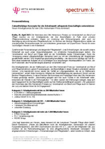 Der von spectrumK, dem BKK Dachverband und dem IKK e. V. vergebene Otto Heinemann Preis zeichnet seit 2015 Unternehmen und Institutionen aus, die mit vorbildlichen Lösungen ihre Angestellten entlasten. Der Wettbewerb steht unter der Schirmherrschaft von Bundeswirtschaftsminister Dr. Robert Habeck. Die hochrangige Jury aus Wirtschaft und Gesundheitswesen nominiert jeweils drei Arbeitgeber*innen in drei Kategorien entsprechend der Zahl der Mitarbeiter*innen. Die Würdigung der Preisträger*innen erfolgt im Rahmen der Berliner Pflegekonferenz am 9. November 2023.