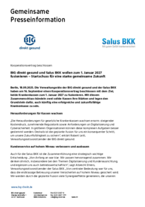 Berlin, 18. September 2025 - Die Verwaltungsräte der BIG direkt gesund und der Salus BKK haben am 16. September einen Kooperationsvertrag beschlossen mit dem Ziel, beide Krankenkassen zum 1. Januar 2027 zu fusionieren. Mit diesem Zusammenschluss bündeln zwei solide Kassen ihre Stärken und legen den Grundstein dafür, auch künftig eine erfolgreiche und zukunftsfähige Krankenkasse zu sein.